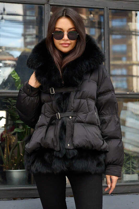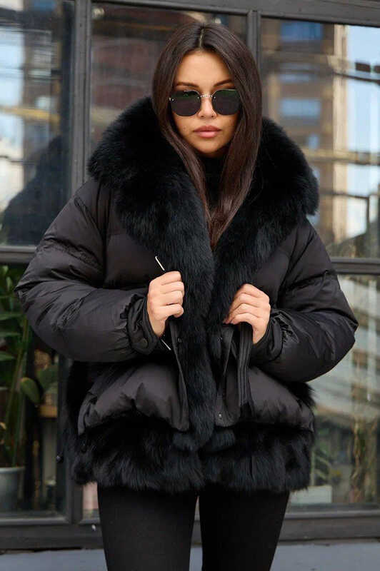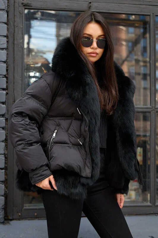 Теплый брендовый пуховик с мехом песца внутри черного цвета