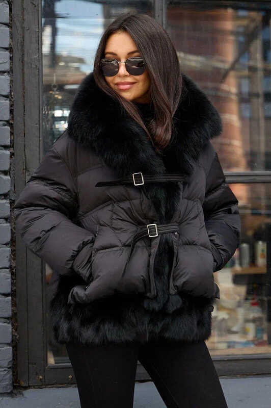 Теплый брендовый пуховик с мехом песца внутри черного цвета купить в Москве