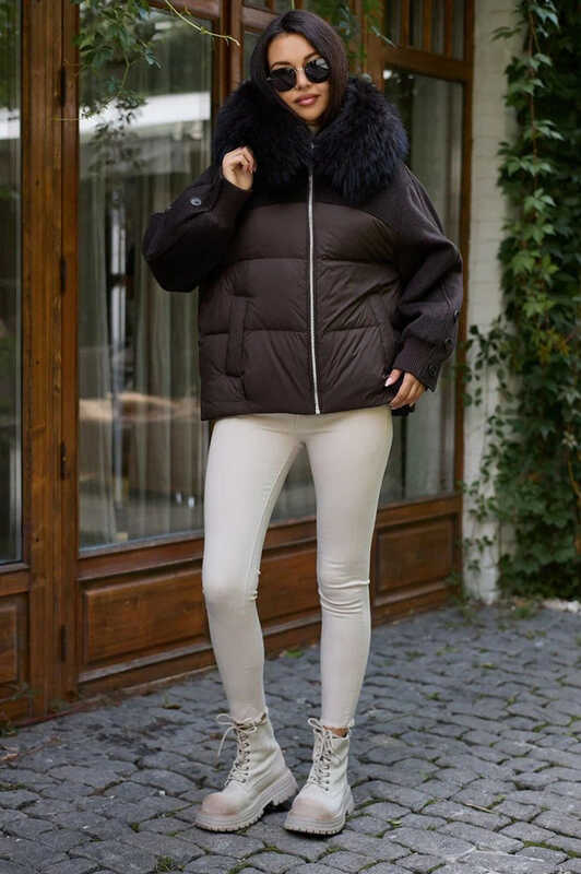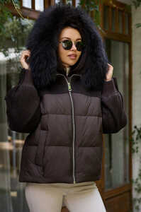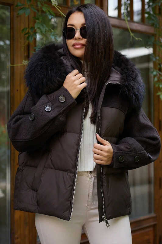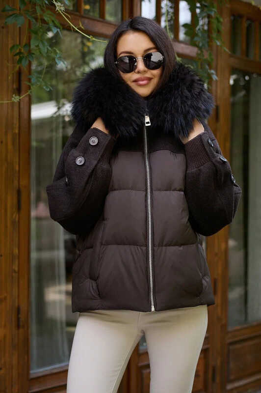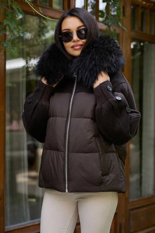 Средней длины коричневый пуховик на зиму 2025-2026 годов. Модель украшена мехом и шерстяными вставками, что придает ей стильный и уютный вид. Наполнитель из пуха и пера обеспечивает отличную теплоизоляцию, позволяя чувствовать себя комфортно даже в самые холодные дни. Этот пуховик идеально сочетает практичность, тепло и элегантность, делая его отличным выбором для зимнего сезона.