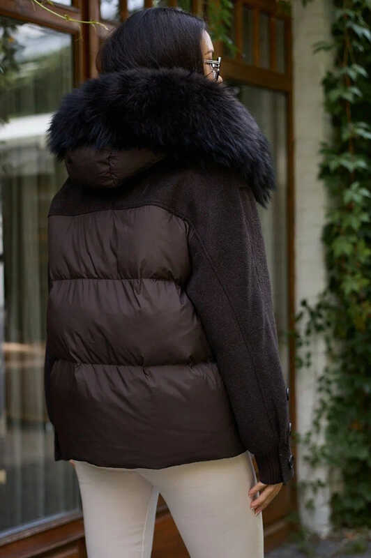 Длинный пуховик с мехом и шерстяными вставками коричневый