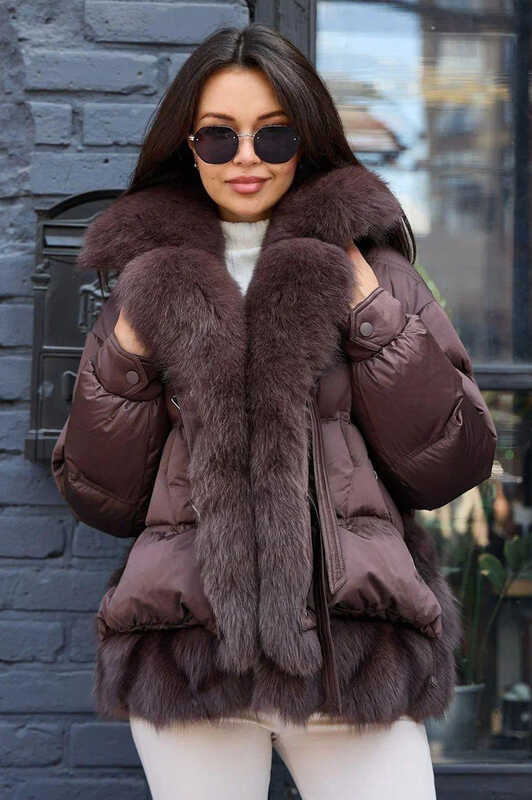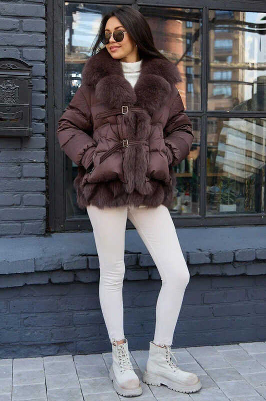 Теплый зимний пуховик с песцом коричнвый