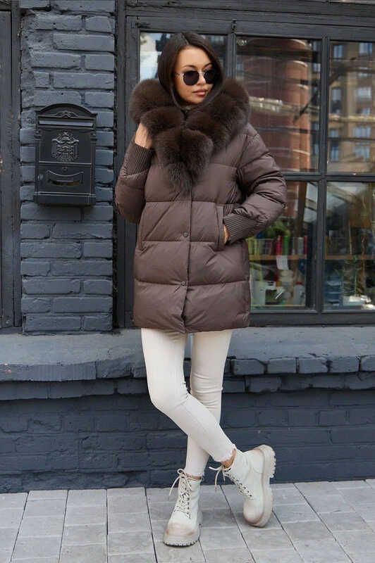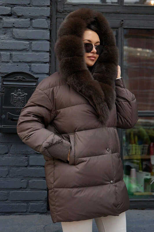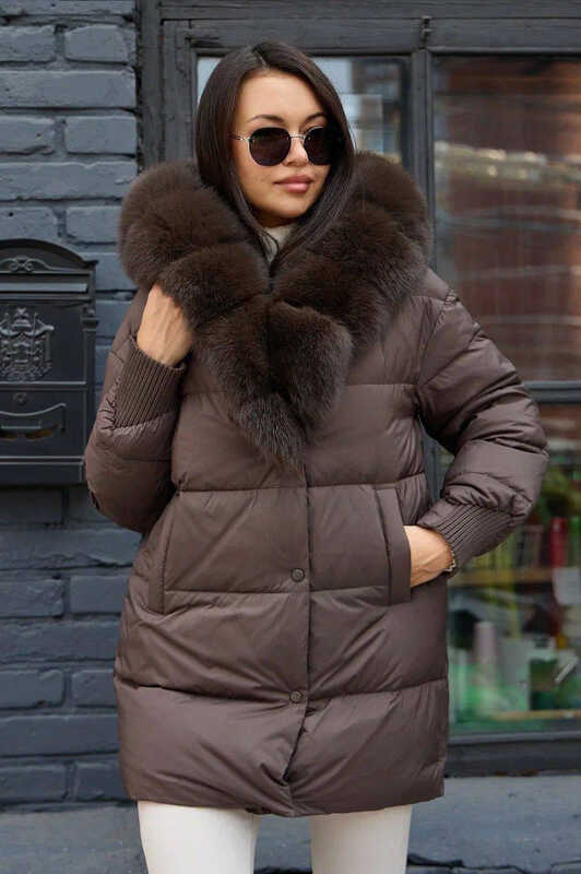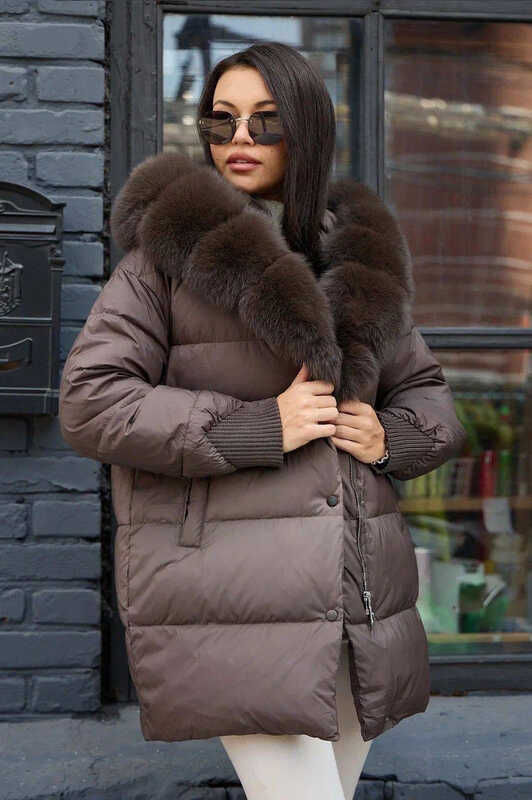 Модная женская пуховая куртка Vivilona коричневого цвета с натуральным мехом песца на капюшоне и воротнике. Внутри — пуховой пакет для надежного утепления. Застежка на молнию и кнопки, рукава оформлены трикотажными манжетами для комфортной посадки и защиты от холода. Отличный выбор для стильной зимы.