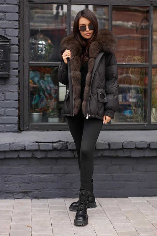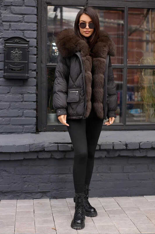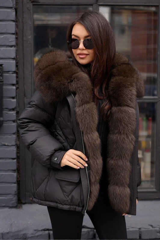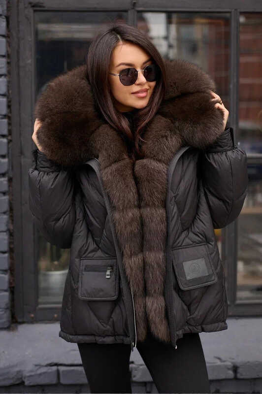 Длинный пуховик с мехом и шерстяными вставками коричневый