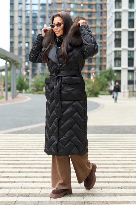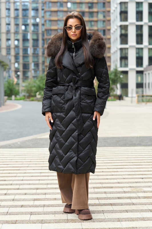Женское зимнее пуховое пальто с капюшоном и поясом купить в Москве