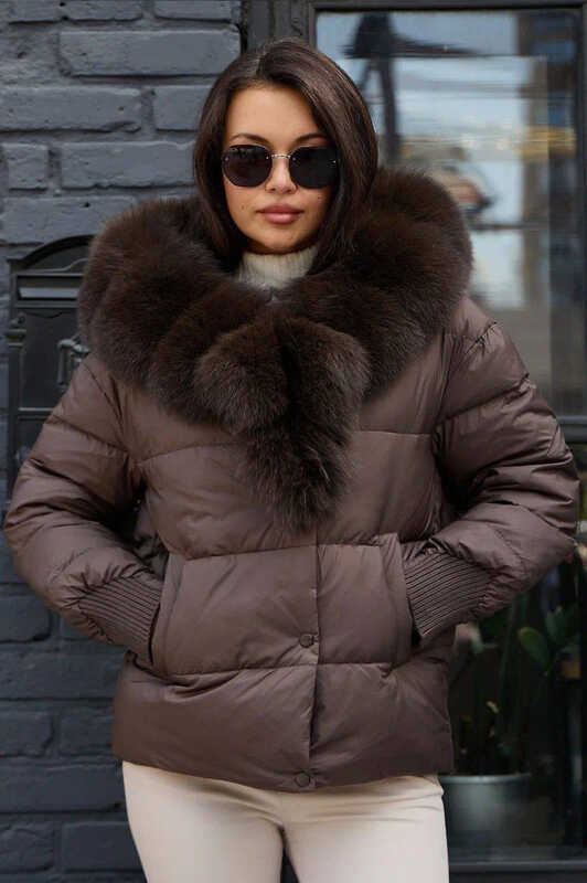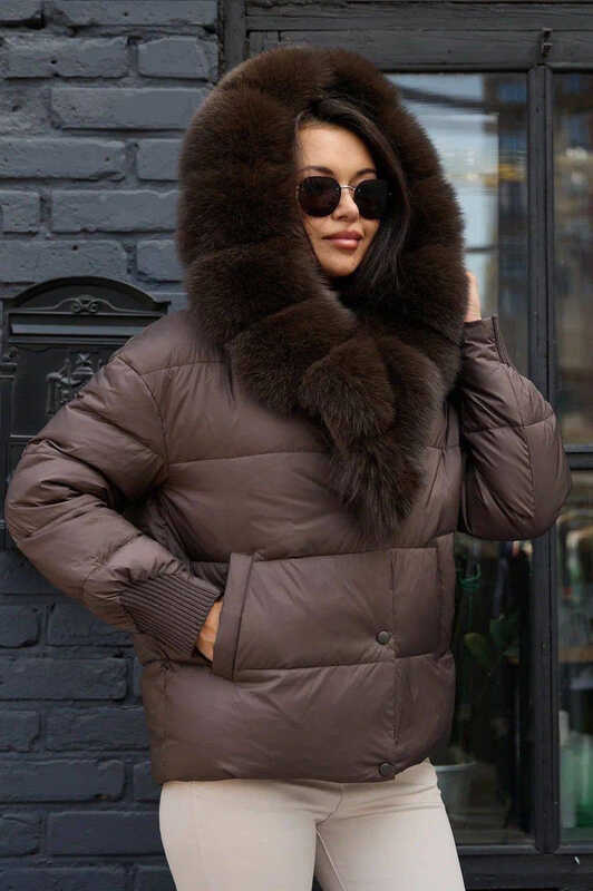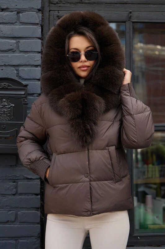 Женская зимняя куртка с большим натуральным мехом песца на капюшоне и воротнике. Внутри утеплена пухом и пером, обеспечивает надежное тепло. Застежка — молния и кнопки для дополнительной защиты от ветра. Идеальный выбор для холодной зимы.