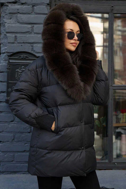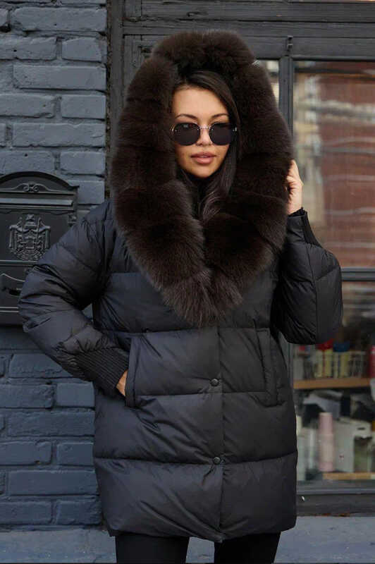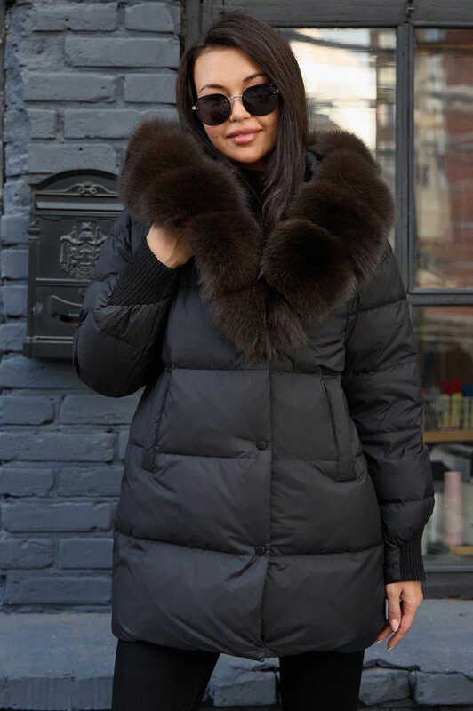 Зимняя куртка-парка с накладными карманами и мехом песца внутри