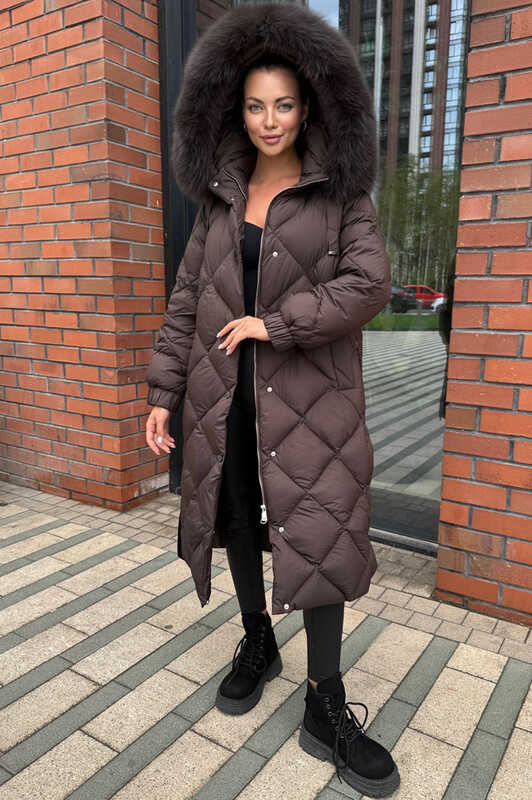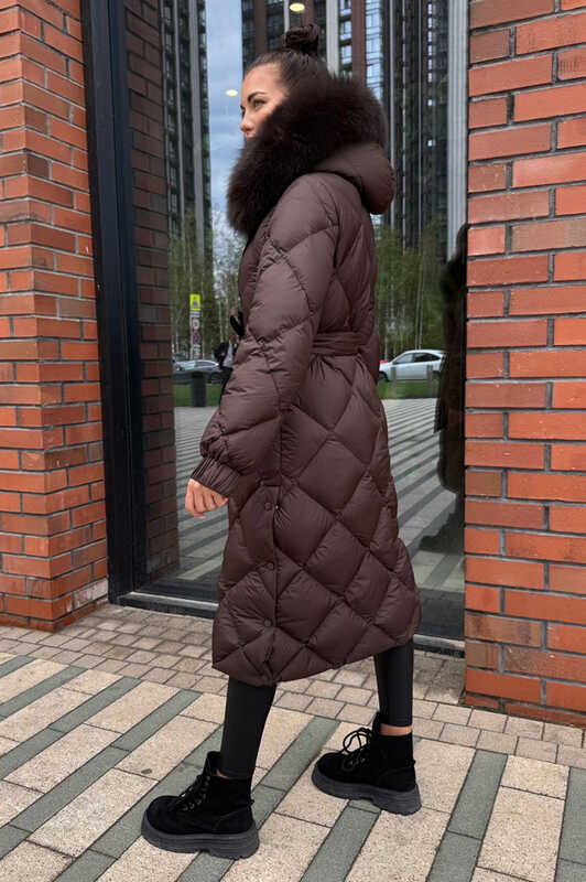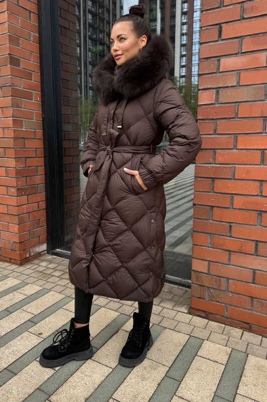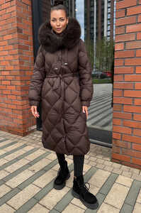Длинный приталенный пуховик шоколадного цвета с поясом и мехом песца на капюшоне. Элегантный и теплый, идеально подчеркивает фигуру и защищает от холода. Отличный выбор для зимних прогулок и создания стильных образов.