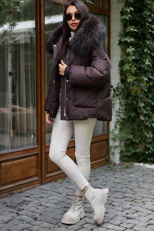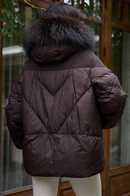 Короткая куртка с енотом шоколадная купить в Москве