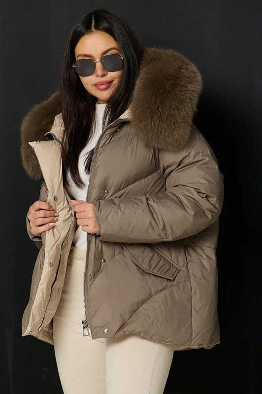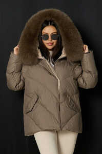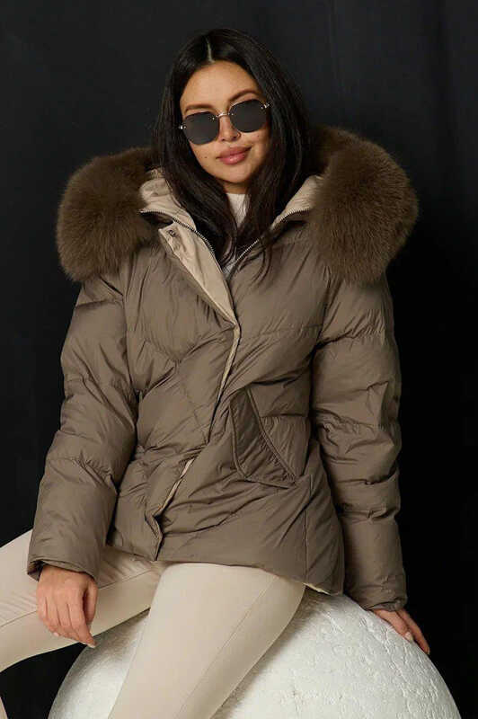 Короткий пуховик 2025-2026 с накладными карманами и мехом шоколадный купить в Москве