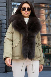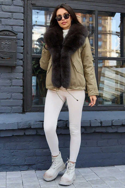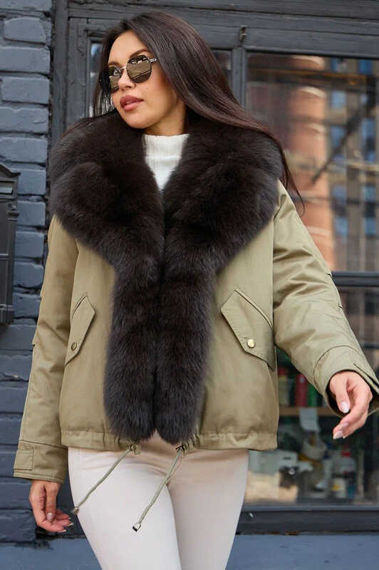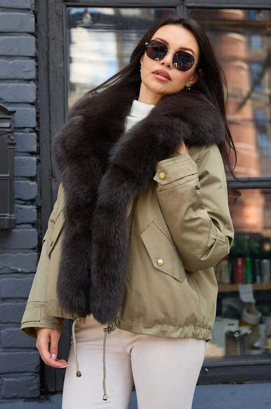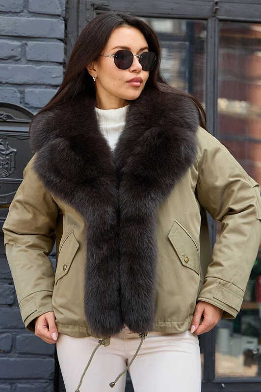 Красивый пуховик с мехом зима 2025-2026 хаки купить в Москве