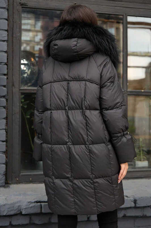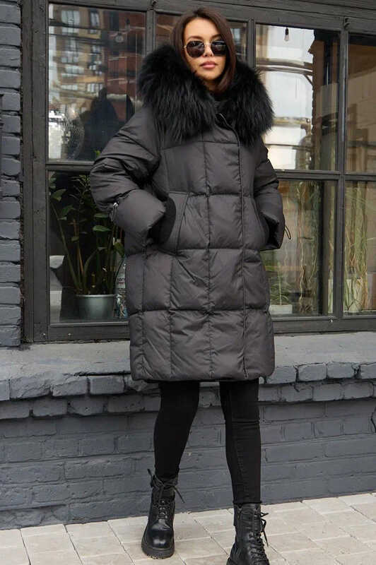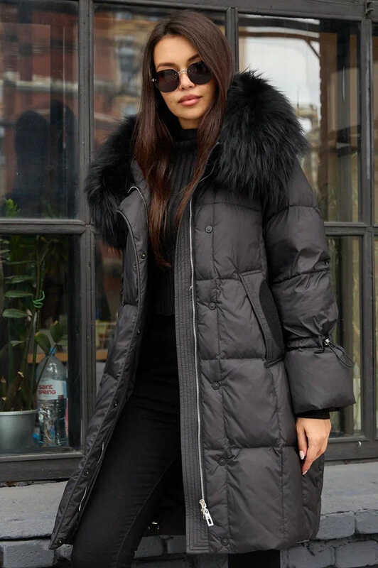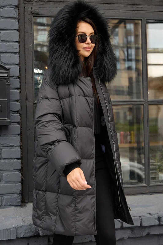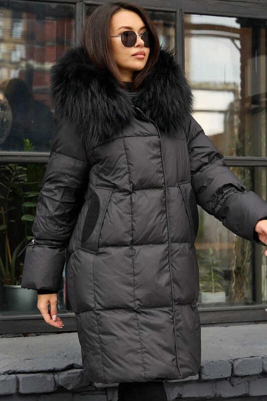 Удлиненный пуховик с енотом и накладными карманами купить в Москве