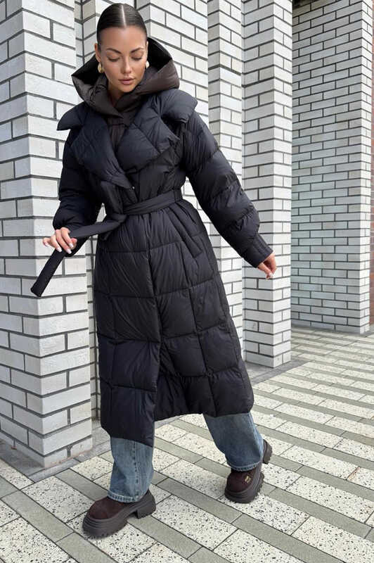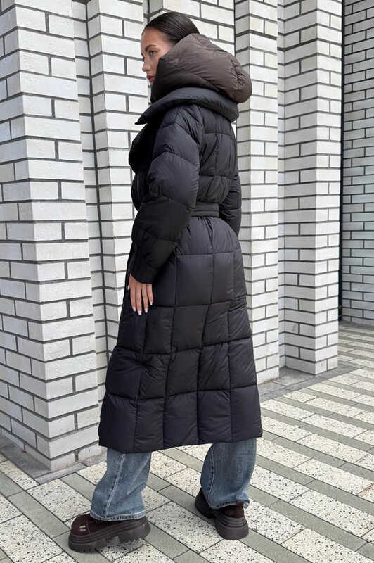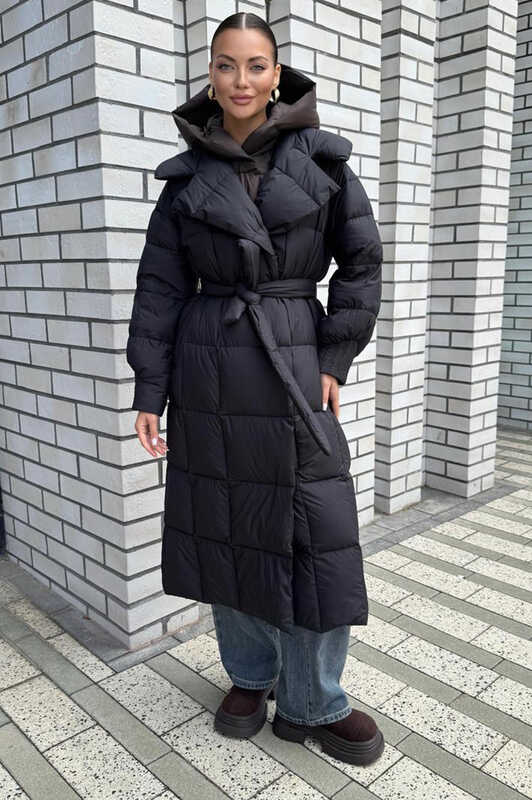 Женский длинный пуховик с манишкой и поясом черный зимний купить в Москве