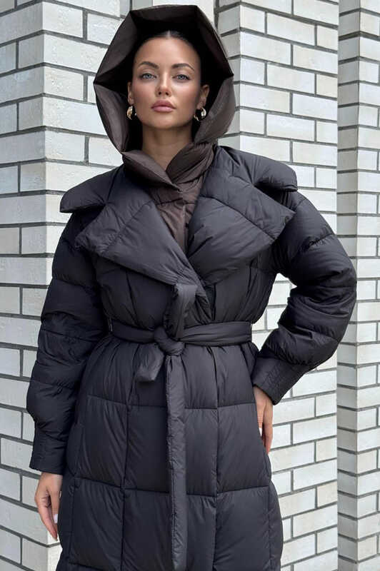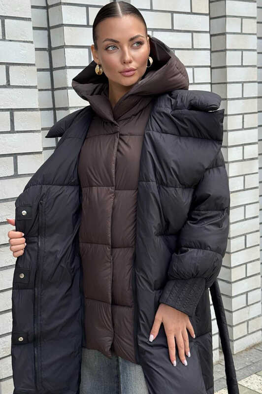 Женский длинный зимний пуховик от фирмы Vivilona черного цвета. Модель оснащена манишкой и поясом, который подчеркивает силуэт. Внутри — коричневая подкладка и утеплитель из пуха для максимального тепла. Рукава с манжетами обеспечивают дополнительную защиту от холода. Идеальный выбор для зимнего сезона 2025-2026 годов, сочетающий стиль и функциональность.